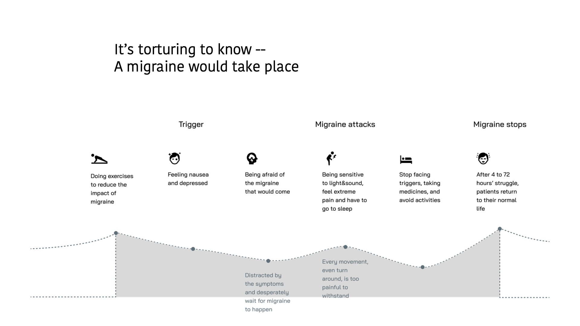 This chart shows the daily routine of a chronic patient who suffers from headaches during her workday. When her migraine happens, she can't work anymore and need to take medicines and rest immediately, which has greatly influenced her work progress. Many devices have emerged on the market in recent years, and she also wants to find an effective method that naturally relieves her pain.